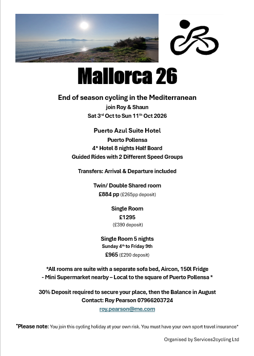 This is a relaxed social cycling week. Partners are welcome as there is lots todo for the non cyclist in Puerto Pollencia.
